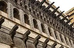 The clock consists of 12 windows and platforms carrying brass bowls. The motion of the clock was presumably maintained by a kind of small cart which ran from left to right behind the twelve doors. At one end, the cart was attached to a rope with a hanging weight; at the other end to a rope with a weight that floated on the surface of a water reservoir that was drained at a regular pace. Each hour one of the doors opened; at the same time a metal ball was dropped into one of the twelve brass bowls.[Note 1] The rafters sticking out of the building above the doors (similar to the rafters of the Bou Inania Madrasa) supported a small roof to shield the doors and bowls.[4] The facade of the building is decorated with carved stucco around the windows and by sculpted arabesque and epigraphic motifs on the wooden rafters and corbels.[5]