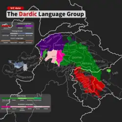 The Dardic languages (also Dardu or Pisaca),[1] or Hindu-Kush Indo-Aryan languages,[2][3][4][5] are a group of several Indo-Aryan languages spoken in northern Pakistan, northwestern India and parts of northeastern Afghanistan.[6] This region has sometimes been referred to as Dardistan.[7]