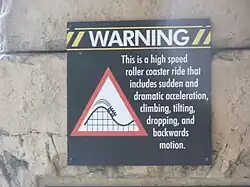 Some dark rides are intense for riders, as they contain vigorous themed elements such as flashing lights, black light effects, sudden drops, stoppages, or other turbulent movements that may be harmful to impaired riders. As more thrill rides are created, the number of attractions that limit riders with disabilities increases. Most commonly, guests who are prohibited from riding are those who are too overweight for the ride vehicle to safely hold the guest's weight or prevent the safety harness from locking in place. Other ride restrictions include those who do not meet a certain height requirement or are too tall to clear the attractions’ set pieces, or those who lack a certain number of arms and legs.[24] Ride requirements are created to ensure all guests’ safety throughout the ride and are posted throughout the attractions’ queue to prevent the companies’ liability if a rider is physically harmed. However, according to Title III of the Americans Disability Act it is illegal for amusement parks to discriminate against any persons with disabilities from equal enjoyment of goods of services in a public place of accommodation.[24] Therefore, companies such as The Walt Disney Company are required by law to accommodate any person with a physical disability who still meets the ride requirements. This often includes guests who use wheelchairs or crutches.