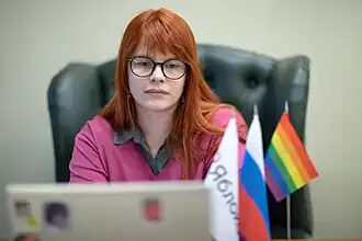 After taking the office of a deputy of the Moscow City Duma, Daria Besedina placed a rainbow flag on her desk, and also supported the right of Muscovites to hold gay pride parades.[19][20][21]