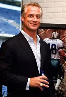 In 2003, Johnston joined the program Players Inc Radio when it moved to Fox Sports Radio. The program was sponsored by NFL Players Inc.[8] Since 2013, Johnston has worked as a color commentator alongside Kenny Albert and formerly Dick Stockton. Previously, Johnston was on the second broadcast team with Stockton from 2001 to 2006 and Albert from 2007 to 2013. He also worked with Tony "Goose" Siragusa, until Siragusa's firing from the network following the 2015 season. In 2000, Johnston got his start calling NFL games by working the regular season and doing the High Definition broadcast of Super Bowl XXXV with Kevin Harlan for CBS Sports. He was an analyst for the NFL Network's "Total Access" until 2012. Johnston also began calling the collegiate Cotton Bowl Classic game for Fox in 2009, first with Pat Summerall, and then eventually Kenny Albert. He also was a guest star of the PBS television series Wishbone in its episode "Moonbone". He appears as a regular guest on First Things First on FS1 (2017/2018) with Cris Carter, Nick Wright, and Jenna Wolfe. In 2017, he continued his esteemed broadcasting career with NFL on FOX, teamed with Chris Myers and Laura Okmin. In 2020, he became paired with Kevin Burkhardt and Pam Oliver.[9] He was paired with Joe Davis and Pam Oliver as the number 2 crew with FOX, but, for 2024, with Tom Brady’s arrival at FOX, he was demoted to the #5 team alongside Kevin Kugler.