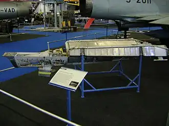In 1967, the Mirage IIIS entered operational service with the Swiss Air Force; the Mirage IIIRS followed two years later.[56] During their service life, Swiss Mirages received several upgrades, including the installation of a Martin-Baker Mk 6 ejection seat, a radar warning receiver, and a TRACOR AN/ALE-40 chaff/flare dispenser positioned at the back under the rear of the fuselage.[57] Starting in 1988, canards and strakes designed by FFA and F+W in cooperation with Dassault, and produced in Switzerland, were fitted to the type.[58] In 1999, Switzerland phased out the last of its Mirage IIIS fleet; the remaining Mirage IIIRS, BS and DS variants were taken out of service in 2003.[59]