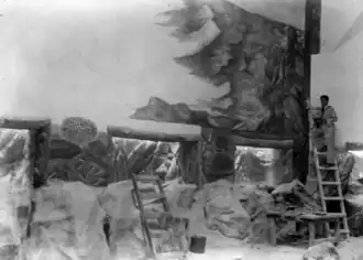 After spending many years in Mexico and being heavily involved in radical political activities, Siqueiros went to Los Angeles, California in 1932 to continue his career as a muralist. Working in a collective unit that experimented with new painting techniques using modern devices such as airbrushes, spray guns and projectors,[17] Siqueiros and his team of collaborators painted two major murals. The first, entitled Street Meeting, was commissioned for the Chouinard School of Art. It depicts a group of workers of mixed ethnicities listening to an angry labor agitator's speech during a break in the workday.[18] The mural was washed over within a year of its unveiling – due to weather-related issues, and perhaps the Communist content of the work. Siqueiros' other significant Los Angeles mural, Tropical America (full name: América Tropical: Oprimida y Destrozada por los Imperialismos, or Tropical America: Oppressed and Destroyed by Imperialism),[19] was commissioned shortly after the unveiling of Street Meeting, and was to be painted on the exterior wall of the Plaza Art Center that faced the busy Olvera Street. Tropical America depicts American imperialism in Latin America, a much more radical theme than was intended for the work. Although it received generally favorable criticism, some viewed it as Communist propaganda, which led to a partial covering in 1934 and a total whitewash in 1938.[20] Eighty years later, the Getty Conservation Institute performed restoration work on the mural.[21] As no color photographs of Tropical America are known to exist, conservators used scientific analysis and best practices to get at the artist's vision of the mural. It became accessible to the public on its 80th anniversary, October 9, 2012.[22] The América Tropical Interpretive Center that opened nearby is dedicated to the life and legacy of David Alfaro Siqueiros.[23][24]