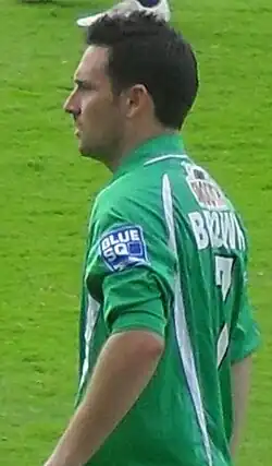 He joined Telford United in August 2002,[2] moving to Hereford United in June 2003, although missed the start of the season after breaking his collar-bone in pre-season training.[3] He remained with Hereford until March 2005 when he moved to Accrington Stanley, signing a new two-year deal in June 2005.[4] In the 2005–06 season Brown helped Stanley to promotion to the Football League, with his former club Hereford taking the second promotion place. Brown struggled to gain a regular place in Stanley's league side and in November 2006 joined Burton Albion on loan.[5] He joined Conference National side York City on trial in September 2008 and featured for the reserves in a 2–1 victory against Grimsby Town.[6] However, he was not offered a contract by the club.[6] He joined Barrow of the Conference on non-contract terms in October 2008.[7] His stay with them was brief, being released in January 2009.[8] He was snapped up later that month by Forest Green Rovers.[9]