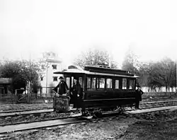 In the early 1880s, Denny was one of Seattle's wealthiest citizens, his fortune estimated at US$3 million.[2] His interests went well beyond his original land claim and Lake Union: he farmed in the Duwamish River valley and platted Seattle neighborhoods, including the Ravenna Park area. In 1890, he moved his family from an already large home at Dexter and Republican Streets to a mansion at the foot of Queen Anne Hill, and the next year he founded the Rainier Power and Railway Company, providing the first streetcar service from Downtown to the University District.[7] The streetcar line ran from 3rd Avenue and Yesler Way in today's Pioneer Square neighborhood downtown to NE 55 Street and 22nd Avenue NE (northeast of the University), and included the purpose-built Latona Bridge, dedicated July 1, 1891, replaced in 1919 by the present day University Bridge.[14]
