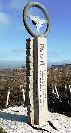 A David Purley memorial, in the form of a sculpture by the British artist Gordon Young, was erected in 2017 close to the site of the former LEC factory in Bognor Regis. It is inscribed with the words that appear on the headstone of his grave at Itchenor: "Gone now your eager smile, high held head and soldier's stride, etched were skies by your elegant style, and this earth enriched by your pride".