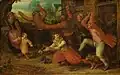 David specialized in elegant figures in park-like landscapes (Outdoor Merry Company, 1610; Vienna, Akademie der Bildenden Künste) as well as Kermis and other village festivals. He also produced Biblical scenes such as Tobias and the Angel (1619, Olana State Historic Site).[1] His landscapes reflect his contact with Gillis van Coninxloo. Vinckboons attracted a number of students; among them were Gillis d'Hondecoeter, Claes Janszoon Visscher and probably Esaias van de Velde.