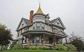 The David and M. Maria Hughes House is a historic building located in Williamsburg, Iowa, United States. David Hughes, a Williamsburg native, was serving as Iowa County Superintendent of Schools and deputy clerk of court when he established the Iowa Lumber Company. The company was renamed Hughes and Brother Lumber when his brother John joined the business. The brothers became wealthy as the result of a building boom in town after the arrival of the Chicago, Milwaukee, and St. Paul Railroad in 1884. David's wife M. Maria (Morse) Hughes was a school teacher. Because of poor eyesight, Hughes retired the year the house was completed, and he sold his share of the business to his brother. He and his wife relocated to their other home in Long Beach, California in 1906, where they owned a considerable amount of real estate. The house remained a single-family dwelling until 1951 when it was divided into three apartments. Starting in the 1980s three separate owners have worked to return the house to its original floor plan.[2]