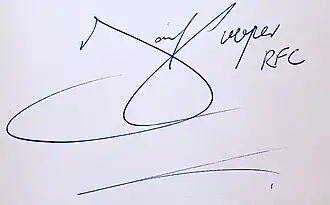 Cooper began dating Christine McMeekin in summer 1975 after meeting at an ice rink.[66] They married in spring 1980 at Coatdyke Congregational Church in the town of Airdrie and had one daughter, Nicola.[67] At the time of Cooper's death, the couple had been separated for several years.[5] Outside of football, Cooper was a keen squash and tennis player and cited the Swedish tennis player Björn Borg as one of his heroes.