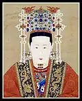 In the Ming dynasty, the daxiushan was known as dashan (大衫). A yellow coloured dashan was worn by the Ming dynasty huanghou (皇后; 'empress'), while a red dashan was worn by the women of the imperial clan, which could include the huangfei (皇妃), huangtaizifei (皇太子妃), qingwangfei (亲王妃), junwangfei (郡王妃).[8] The red dashan was also worn by the Mingfu,[8] titled court women of first rank.[6] The Ming dynasty also bestowed dashan to the queens of Joseon, where it became known as daesam (Korean: 대삼; Hanja: 大衫; RR: daesam).[6]