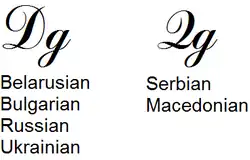 In italic (Russian) type, the lowercase form looks more like the lowercase Latin ⟨d⟩, a mirrored numeral 6 or a partial derivative symbol ⟨∂⟩. Southern (Serbian, Bulgarian, Macedonian) typography may prefer a variant that looks like a single-storey lowercase Latin ⟨g⟩. Cursive lowercase De has the same two shapes, but with a different distribution: for example, the g-shaped variant is a standard for schools in Russia, Ukraine, Belarus but also used for certain typefaces with OpenType features.[1]