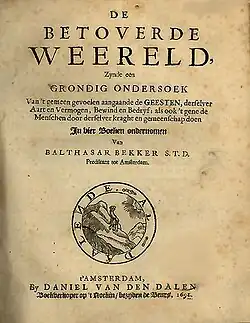 His best known work was De Betoverde Weereld (1691), or The World Bewitched (1695), in which he examined critically the phenomena generally ascribed to spiritual agency. He attacked the belief in sorcery and "possession" by the devil. Indeed, he questioned the devil's very existence.[2] He applied the doctrine of accommodation to account for the biblical passages traditionally cited on the issue.[5] Bekker argued that practices decried as witchcraft were little more than fatuous but harmless superstitions.[6] The book had a sensational effect and was one of the key works of the Early Enlightenment in Europe. It was almost certainly the most controversial.[7]