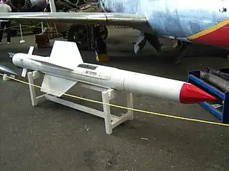 The de Havilland Firestreak is a British first-generation, passive infrared homing (heat seeking) air-to-air missile. It was developed by de Havilland Propellers (later Hawker Siddeley) in the early 1950s, entering service in 1957. It was the first such weapon to enter active service with the Royal Air Force (RAF) and Fleet Air Arm, equipping the English Electric Lightning, de Havilland Sea Vixen and Gloster Javelin. It was a rear-aspect, fire and forget pursuit weapon, with a field of attack of 20 degrees either side of the target.[1]