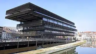 De Krook is a library and media center in Ghent (Dutch: Gent), East Flanders, Belgium. It is an initiative of the city of Ghent, Ghent University and IMEC, and describes itself as "a place of inspiration for knowledge, culture and innovation" in the city.[1][2] The library opened its doors on 10 March 2017, though construction was not fully completed until a year later.[3] Its name refers to the curve ("krook") of the river Scheldt that wraps around the northern and eastern sides of the site, and to its district, the Waalse Krook.