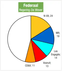 The De Wever government is the incumbent federal government of Belgium after the 2024 Belgian federal election. On 31 January 2025, a final agreement was reached between N-VA, CD&V, Vooruit, MR and Les Engagés to form a so-called "Arizona coalition", named after the colours of the Arizona state flag. The new government is led by Bart de Wever, who is the first Flemish nationalist Prime Minister of Belgium.[1] The ministers were sworn in before King Philippe on the third of February.