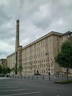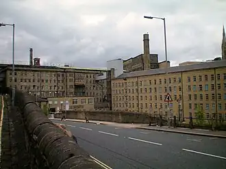 Dean Clough in Halifax, Calderdale, West Yorkshire, England, is a group of large factory buildings built in the 1840s–60s for Crossley's Carpets,[1] becoming one of the world's largest carpet factories (half a mile long with 1,250,000 square feet (116,000 m2) of floorspace).[2][3] After years of declining production it closed in 1983, when it was bought by a consortium led by Sir Ernest Hall which developed the Grade II listed site for various commercial and cultural uses. It is now seen as a leading example of successful urban regeneration.[4][5][6] Dean Clough is located on the north side of Halifax near the Victorian North Bridge and the modern flyover sections of the Burdock Way relief road system. The converted mills now house about 150 large and small businesses and arts venues including Crossley Gallery and several other art galleries and the Viaduct Theatre, home base for the Northern Broadsides theatre company.[7] Phoenix Radio 96.7 FM has its studios in E Mill and Prestige Flowers has offices in G Mill.