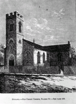 Though formally established in 1832, it was not until 1833 that the congregation was formally organized. The site was donated by Nicholas Sparks in 1832. The first service in Christ Church Bytown took place on July 21, 1833. Due to decreased givings and pledges over the next two years, the parishioners found themselves seated on temporary rough planks for pews, and the walls and ceiling were not completed for a number of years. The church had to be closed during the winter as two stoves were needed for sufficient heating, but only one was available. In spite of appeals, no funds were made available, and it was not until 1835 that the church finally owned its own property. By 1841, due to rapid growth in the population of Bytown, it was recognized that the church was not adequate in providing for the needs of the growing congregation. A proposed enlargement plan was drawn up, and Nicholas Sparks gave the additional land required for the enlargement. On July 12, 1841, the cornerstone was laid. Subscriptions were received from far and wide, and the enlargements were fully completed by October 1843. The church was consecrated and given its name, Christ's Church. Over the next quarter-century, a number of attempts were made to begin the building of a larger church. In 1860, Thomas Fuller designed a central school house for the congregation, which was demolished in 1872.[2] In 1861, Alexander Cowper Hutchinson (architect) designed a stone font inside the chapel, however the church was demolished in 1872.[3] In 1865, a rectory was completed immediately west of the existing church building.