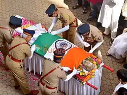 In recognition of his contributions to Indian cinema, Manoj Kumar was given a state funeral by the Government of India. His mortal remains were draped in the Indian national flag, and a police unit gave a three-volley gun salute at the cremation site, Pawan Hans Crematorium, Mumbai. The last rites commenced at approximately 11:30 am, with his sons, Vishal and Kunal, lighting the funeral pyre.[16]