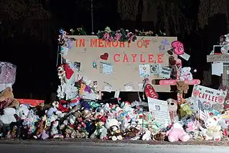 Since the end of the trial, various movements have arisen for the creation of a new law, called "Caylee's Law", that would impose stricter requirements on parents to notify law enforcement of the death or disappearance of a child.[176] One such petition, circulated via Change.org, has gained nearly 1.3 million electronic signatures.[177] In response to this and other petitions, lawmakers in four states—Florida, Oklahoma, New York and West Virginia—have begun drafting versions of Caylee's Law since 2011. The law in Oklahoma would require a child's parent or guardian to notify police of a missing child within 24 hours, and would also stipulate a time frame for notification of the disappearance of a young child under the age of 12.[176][178] The Florida law would make it a felony if a parent or legal guardian fails to report a missing child in a timely manner if they could have known that the child would be in danger.[179] The call for mandatory reporting laws has been criticized as being "purely reactive, overly indiscriminating and even counterproductive."[180] One critic noted the law could lead to overcompliance and false reports by parents wary of becoming suspects, wasting police resources and leading to legitimate abductions going uninvestigated during the critical first few hours. Additionally, innocent people could get snared in the law for searching for a child instead of immediately calling police.[181]