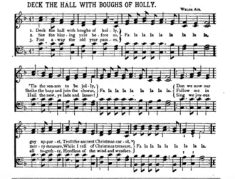 The third and fourth "Fa la la" lines sung to the words "Deck the Hall" differ from those sung or played in Wales, the fourth having a more arpeggiated melody in the Welsh version and the third differing in both melody and rhythm.