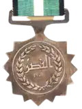 The medal consists of two synonymous surfaces of copper coated with oxidised silver: the lower surface consists of fourteen in a circle of 50 millimetres in diameter bearing on the back the phrase 'Victory 1971' in the middle of a circle of 32 millimetres in diameter and on both sides of it are olive branches. The upper surface is a circle with a diameter of 32 millimetres, on which is the picture of the President, Commander Jaafar Muhammad Nimeiri, receiving the torch of victory from the masses of the people on Victory Day. The decoration hangs from a ribbon of shiny silk, 32 millimetres wide. It consists of two black lines on both sides of the ribbon, each 3 millimetres wide. Each line is directly followed by a green line of the same colour as the flag of Sudan. Its width is 10 cm. In the middle is a white line whose width is 6 millimetres.[5]
