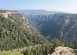 There is a vertical a drop that forms a deep canyon with vertical cliffs and slopes that make up the canyon walls. The most common way to observe the canyon, given its inaccessibility, is from the Deep Creek Overlook, located 2,300 feet (700 meters) above the floor of the canyon along Coffee Pot Road. A 2015 report found that the portion of the creek that flows through the canyon is "suitable for inclusion in the National Wild and Scenic River System (listings maintained by the National Park Service of the United States Department of the Interior)."[5] However, the creek canyon has not gained any new official recognition, but advocacy groups, such as American Rivers, continue to draw attention to Deep Creek Canyon, hoping that the United States Congress will eventually preserve and declare it a Wild and Scenic River.[6][7]