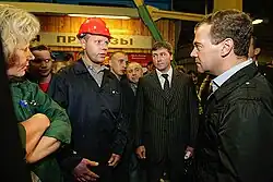 President Dmitry Medvedev with Sevmash employees in July 2009. Sevmash is Russia's largest shipbuilding company and the country's only producer of nuclear submarines.