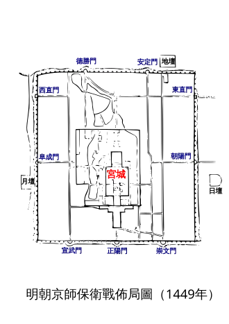 Map of Beijing in 1449. Esen's forces were facing the Deshengmen and Xizhimen gates from the North West corner of the map.