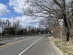 The current route was originally legislated in 1911 as part of the Delaware River Drive, a named state highway that was proposed to run from along the Delaware River from Trenton north to the New York border in Montague Township.[9] Route 29 was originally defined in 1927 to run from Trenton to Newark. The original route ran from downtown Trenton along State Street and Sanhican Drive. From there, it followed its current alignment to Lambertville, where it followed present-day Route 179 to Ringoes to present-day CR 514, which it followed to Woods Tavern. The route turned north on US 206 (also designated Route 31) and followed that route to Somerville, where it followed US 22 to Newark. The current alignment of Route 29 from Lambertville to Route 12 in Frenchtown was designated Route 29A in 1927.[10][11]