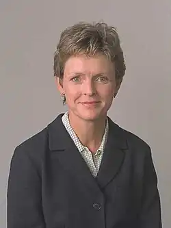 In March 2002, Evans announced her intention to step down from the National Assembly at the 2003 assembly election.[36] She said she felt she was not spending enough time with her children and had therefore decided to resign to spend more time with them.[37][38][39] By this time, she was considered a rising star in the Labour Party and had been reportedly earmarked for a role in the cabinet if Labour won the election. She said she was open to returning to frontline politics sometime in the future, but not for the next few years.[39] On the same day of her announcement, two Welsh language campaigners from the Welsh Language Society were arrested for vandalising Evans' constituency office in Llanelli and spraying it with black paint. Evans condemned their actions.[37] After Labour AM Ron Davies announced in March 2003 that he would stand down at the assembly election, Evans was considered as a potential contender in Labour's candidate selection for his constituency of Caerphilly. However, she ruled herself out of the contest.[40] As planned, Evans did not contest the 2003 election, and her seat in Mid and West Wales was taken by Conservative politician Lisa Francis.[22]