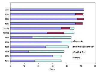 The Democrat Party made its best showings in parliament in 1948, 1976, and 1996. It has never won an outright parliamentary majority. The party's electoral support bases are southern Thailand and Bangkok, although the party's strength in Bangkok has declined rapidly since the 2019 general election. Since 2004, Democrat candidates won three elections for the governorship of Bangkok. From 2005 to 2019, the Democrat Party was led by Abhisit Vejjajiva, former prime minister.