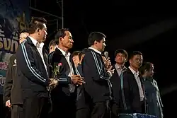 The 2019 election proved to be a major upset to the party, which came in fourth place and won no seats in its traditional stronghold of Bangkok, leading to Abhisit resigning as party leader, having stated previously that he would do so if the party won fewer than 100 seats.[69] Jurin Laksanawisit was elected to succeed him on 15 May.[70] The Democrats then formed a pact with the Bhumjaithai Party, intending to use their combined 103 MPs as leverage for negotiations with other parties.[71] At the first meeting of the new parliament, Democrat ex-prime minister Chuan was nominated speaker of the House of Representatives by PPRP deputy leader Nataphol Teepsuwan and was elected to that office. This move was seen by commentators as a signal that a deal had been reached and a coalition with the Phalang Pracharat party was imminent.[72] The coalition was finally made official on 4 June, one day before the National Assembly was scheduled to vote for the prime minister, following a vote by party MPs and executives.[73] Following this, Abhisit resigned as MP, stating that he could not break his previous stance on not supporting Phalang Pracharat.[74]