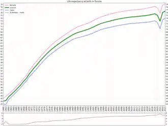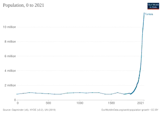 Tunisia's population was estimated to be around 12.04 million in 2022.[7] In the generally youthful African continent, Tunisia's population is among the most mature. This is because the government has supported a successful family planning program that has reduced the population growth rate to just over 1% per annum, contributing to Tunisia's economic and social stability.[8]