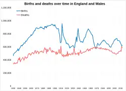 Periods of instability over the 15th century, such as the Wars of the Roses, caused the population to increase at a slower pace.[10] The general factors behind this were a high mortality rate due to war, fewer marriages within the population, late marriages (keeping fertility levels low) and a net emigration of English people out of the country.[10] By the 16th century, the situation changed due to political stability under the Tudor monarchy and little civil unrest, which would have resulted in a higher mortality rate.[10] While this was overturned with the English Civil War in 17th century, it allowed the population to grow at a faster pace, causing the population of England to reach a pre-collapse total of 5.74 million by 1750.[10]