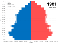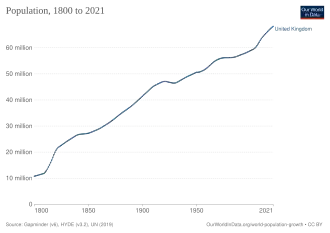 The first Census in 1801 revealed that the population of Great Britain was 10.5 million.[22] England's population was 8.3 million, Wales' population was 0.6 million, and Scotland had a population of 1.6 million.[10] In Ireland, the population was between 4.5 and 5.5 million inhabitants.[23][24] Since 1801, a census has been conducted almost every decade. In Ireland, it was conducted for the first time in 1821.[10]