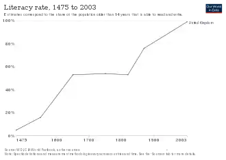 The United Kingdom's high literacy rate of 99% at age 15 and above,[11] is attributable to universal state education, introduced at the primary level in 1870 (Scotland 1872, free 1890[12]) and at the secondary level in 1900. Parents are obliged to have their children educated from the ages of 5 to 16 years. In England, 16–17-year olds should remain in education, employment or training in the form of A-Levels, vocational training, and apprenticeships, until the age of 18.[13]
