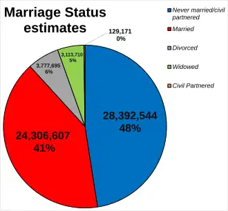 The population of the UK in the last recorded census in 2011 was 63 million, of whom 31 million were male and 32 million female. The 2011 census recorded the population of England as 53.0 million, Scotland as 5.3 million, Wales as 3.1 million, and Northern Ireland as 1.8 million.[32] At the last recorded population estimate, it was estimated that the UK population was at a total of 67,081,234 people.