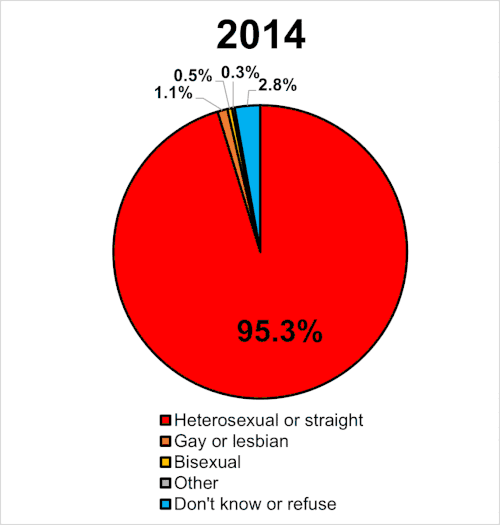 In another IFOP survey of 9,515 French adults conducted later that same year, 6.5% of the sample identified as homosexual (3%) or bisexual (3.5%). Among LGBs, men outnumbered women by more than 2 to 1.[46]