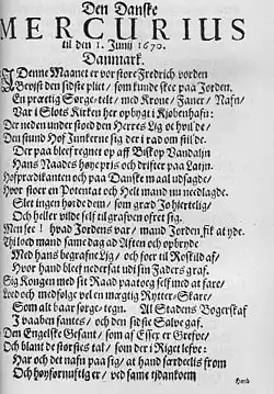 Den danske Mercurius was a Danish newspaper, first published on 1 August 1666, by Anders Bording. He founded his versified newspaper, published in Danish with the title Den Danske Mercurius. The newspaper was published on the order of the Sovereign. Its publishing was a turning point in the history of Danish journalism.