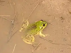 Pseudines are notable for because despite being tree frogs, they have convergently evolved with true frogs and have lost most of their tree dwelling traits, becoming semi-aquatic or aquatic.[1] Their name references this similarity, with Pseudis coming from the Greek ψεῦδος (pseudos) which means "false" or "pretending". This is evident in how the intercalary elements, which are the spaces in between a frog's digits, have become ossified in order to strengthen them and help them swim in the water more efficiently. Normally in tree frogs, these intercalary elements remain unossified in order to allow their hands and feet to be flexible.[1][6] They also have a unique ligament cap that connects their knee to their pelvis that has not yet been seen in any other type of frog.[7] These frogs have a chromosome component of 2n = 24, the exceptions being Scarthyla goinorum with 2n = 22 and Pseudis cardosoi with 2n = 28.[1] In the wild they are preyed on by a variety of animals, including aquatic insects, spiders, and birds such as the buff-necked ibis and large-billed tern.[8]