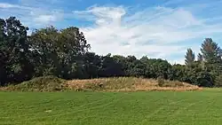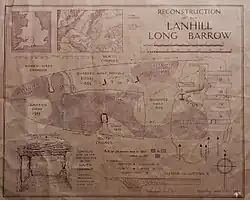 Another project was Lanhill Long Barrow (known locally as Hubba's Low). The barrow had been recorded by John Aubrey in 1647, but was subsequently largely obliterated through quarrying and invasive excavation. In 1954 the Ministry of Works gave permission for Lanhill to be cleared of brambles. Grant King wrote several letters of complaint to the Ministry and other heritage organisations, highlighting the damage caused by using a bulldozer to undertake the clearance. Ultimately, King lead an excavation in 1963 to record the barrow. He called upon his Bury Wood Excavation Club to assist in rebuilding many of the damaged areas. Through painstaking investigation he was able to construct a plan of the barrow.[8]