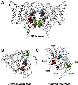 Three-dimensional homology model of human CLC-5 based on the structure of ClC-ec1 (7) showing the locations of each mutated residue