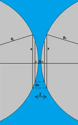 If there are two spheres of radii and on the axis, and the spheres are distance apart, where is much smaller than and , then the force, , in the direction is