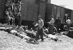 On the evening of the next day, 28 June 1941, army groups, the local police, gendarmes, German soldiers attached to the Romanian army, and ad-hoc mobs incited by the media and the secret services descended upon the Jewish population of the city which was accused to have pro-Soviet sympathies, had armed itself and was attacking the army, and even had signalled enemy planes where to attack. At 9 pm, shots were heard throughout the city and pillaging, rape, and murder of the Jews started. On 29 June the survivors where taken to the train stations, having to walk through the streets filled with dead bodies. There, they were forced into train cargo wagons.[21] In the heat of the summer, with no water or food, and crammed against each other, most of them died before reaching the destination. A survivor recalled: