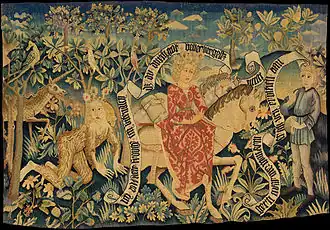 Numerous depictions of the poem were produced, including a long piece of tapestry with fragments now held in the Metropolitan Museum of Art in New York, Museum für Angewandte Kunst in Cologne, the Victoria and Albert Museum in London, the Germanisches Nationalmuseum in Nuremberg, and in Paris. The Metropolitan piece shows the Prince of England as a wild man, whilst the Princess of France, mounted on her palfrey, finds refuge with a poor man.[22][23] According to Jennifer Eileen Floyd, the existence of such tapestries is evidence of a bourgeois market for hangings and tapestries that depicted, amongst other things, the hunt; such hangings were not only within the reach of nobles, but also rich merchants and gentry.[24]