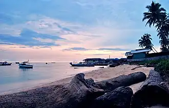 The Derawan Islands (Indonesian: Kepulauan Derawan) are in the province of East Kalimantan in Indonesia. They consist of 31 islands, most well known among these are the islands of Derawan, Kakaban, Maratua, and Sangalaki. There are also numerous submerged reefs and islets. They are located in the Sulawesi Sea, on the coastal shelf of East Kalimantan (2°17′N – 118°13′E). The islands are part of the Berau Regency.