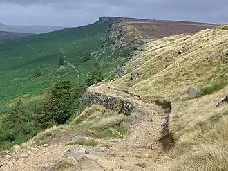 There are gritstone escarpments where the limestone plateau meets the Dark Peak horseshoe. These include:[5][6]