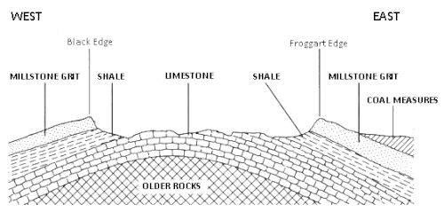 The layers of carboniferous limestone were formed from the carbonate shells of countless invertebrate sea creatures, deposited in a warm shallow sea in the Brigantian stage of the Carboniferous period (around 330 million years ago). About 30 million years later, coarser debris from rock erosion was washed onto the earlier shell layers. These deposits were compressed over time into rocks which were subsequently uplifted and folded into a dome. Later erosion of the younger Namurian-age sandstones (the finer shales and the rougher gritstones) has exposed the limestone strata. The shells can be seen as fossils (crinoids, trilobites and shellfish) in the limestone outcrops, cliffs and caves. At times when parts of the sea bed rose, plants grew and their decayed remains formed a few shallow deposits of coal on the western side of the dome. Volcanoes around the sea bed spewed out lava flows which have formed local outcrops of volcanic basalt (dolerite).[2][3]