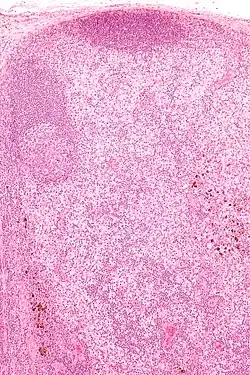 | Micrograph showing dermatopathic lymphadenopathy with the characteristic paracortical histiocytosis and melanin-laden macrophages. H&E stain. | |