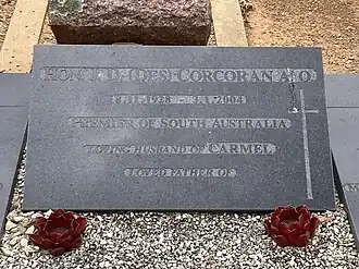 Corcoran died in Adelaide on 3 January 2004, aged 75, after a long illness.[5][42] Upon his death, Rann, by then premier himself, described the strong and historic political partnership between Dunstan and Corcoran as "very successful", despite the two being "chalk and cheese". Rann went on to say that Corcoran would be "sorely missed" as someone who was larger than life and respected across the political spectrum in South Australia.[50] He also noted that Corcoran would be remembered "for his gregarious personality and how he so often used humour to heal differences". Don Hopgood, who served as education minister alongside Corcoran, observed that he brought strength to the Dunstan administration. Then opposition leader Dean Brown, who had himself served as premier between 1993 and 1996, stated that Corcoran was "approachable and enjoyed a good yarn and joke", and recalled that "his word could always be trusted and all members of the Parliament held him in very high esteem".[42] Corcoran was farewelled with a state funeral held at St Francis Xavier's Cathedral, Adelaide, on 8 January,[60] and was buried at North Brighton Cemetery.[61]